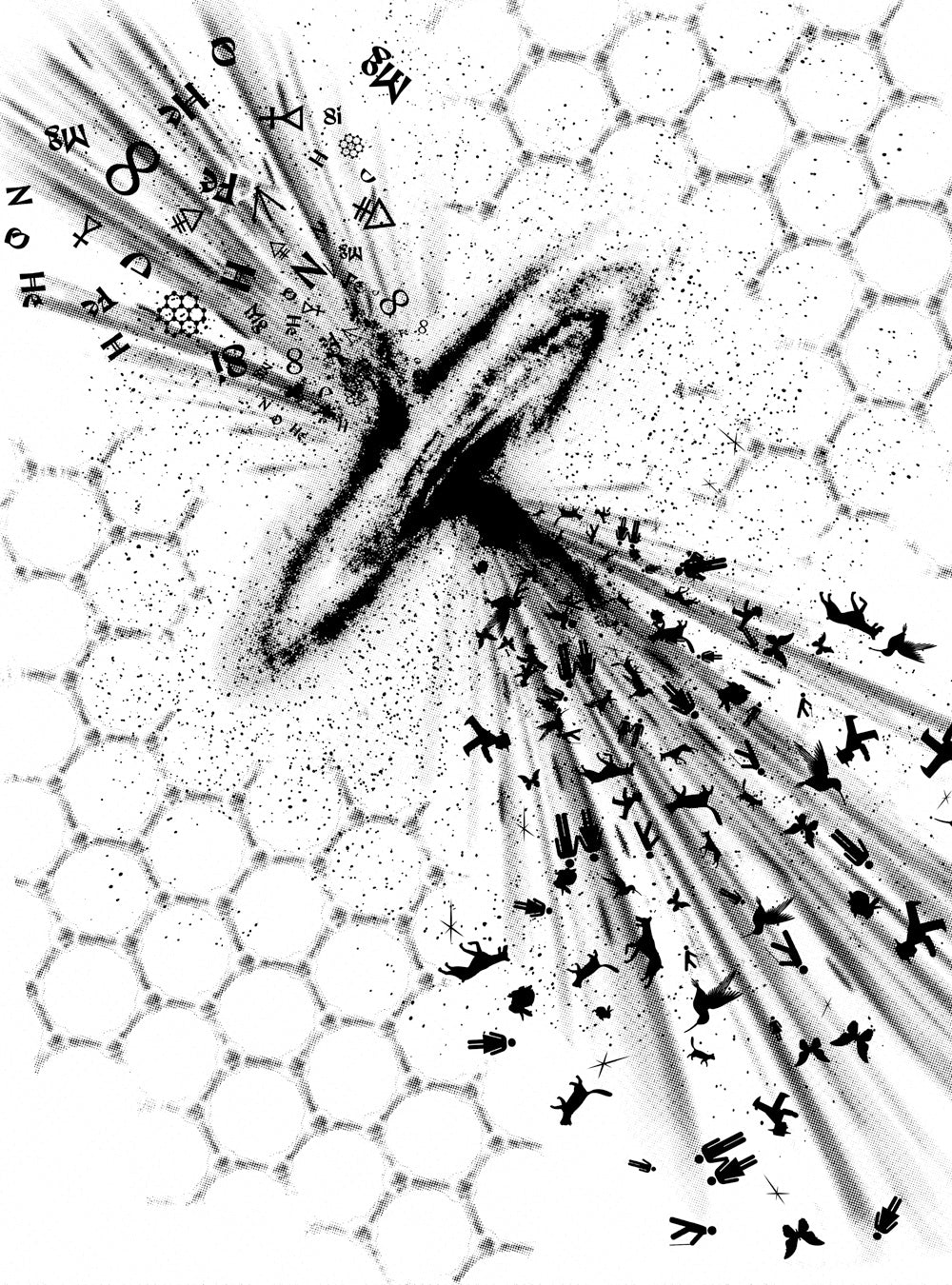 Black T-shirt for men featuring a silver-grey galaxy motif. The print depicts cosmic elements as a visual metaphor bridging science, myth and dystopian symbolism. Also available in black on black.