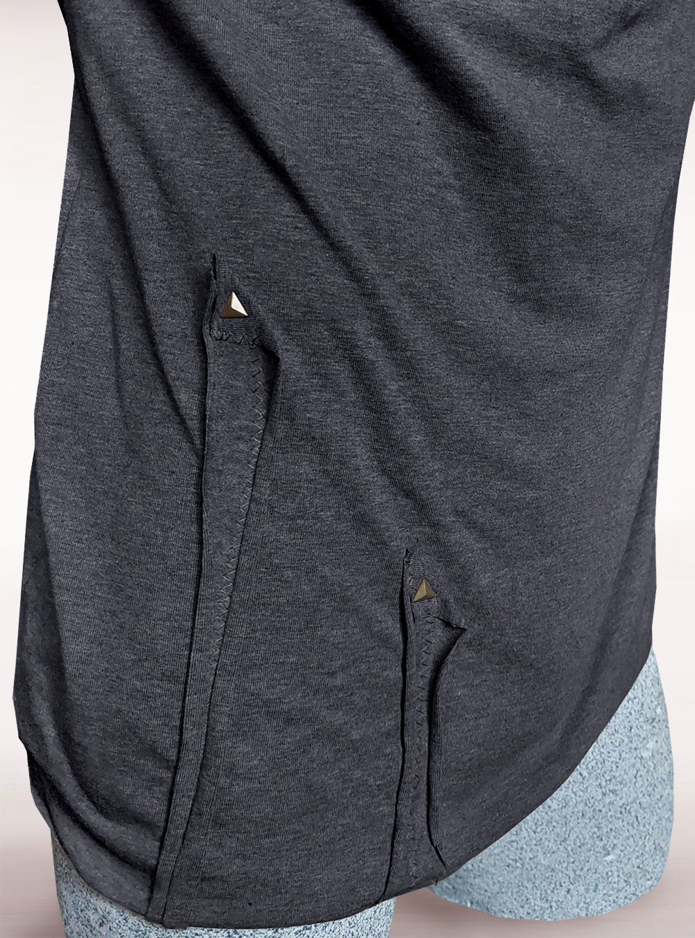 Longsleeve mit V-Ausschnitt, aufgenähten Streifen-Details und Pyramiden-Nieten. Die Applikationen an Schulter und Armen setzen dystopische Akzente und verleihen dem Ärmelbereich zusätzliches Volumen. Erhältlich in Schwarz, Anthrazit-meliert oder Blau-meliert.