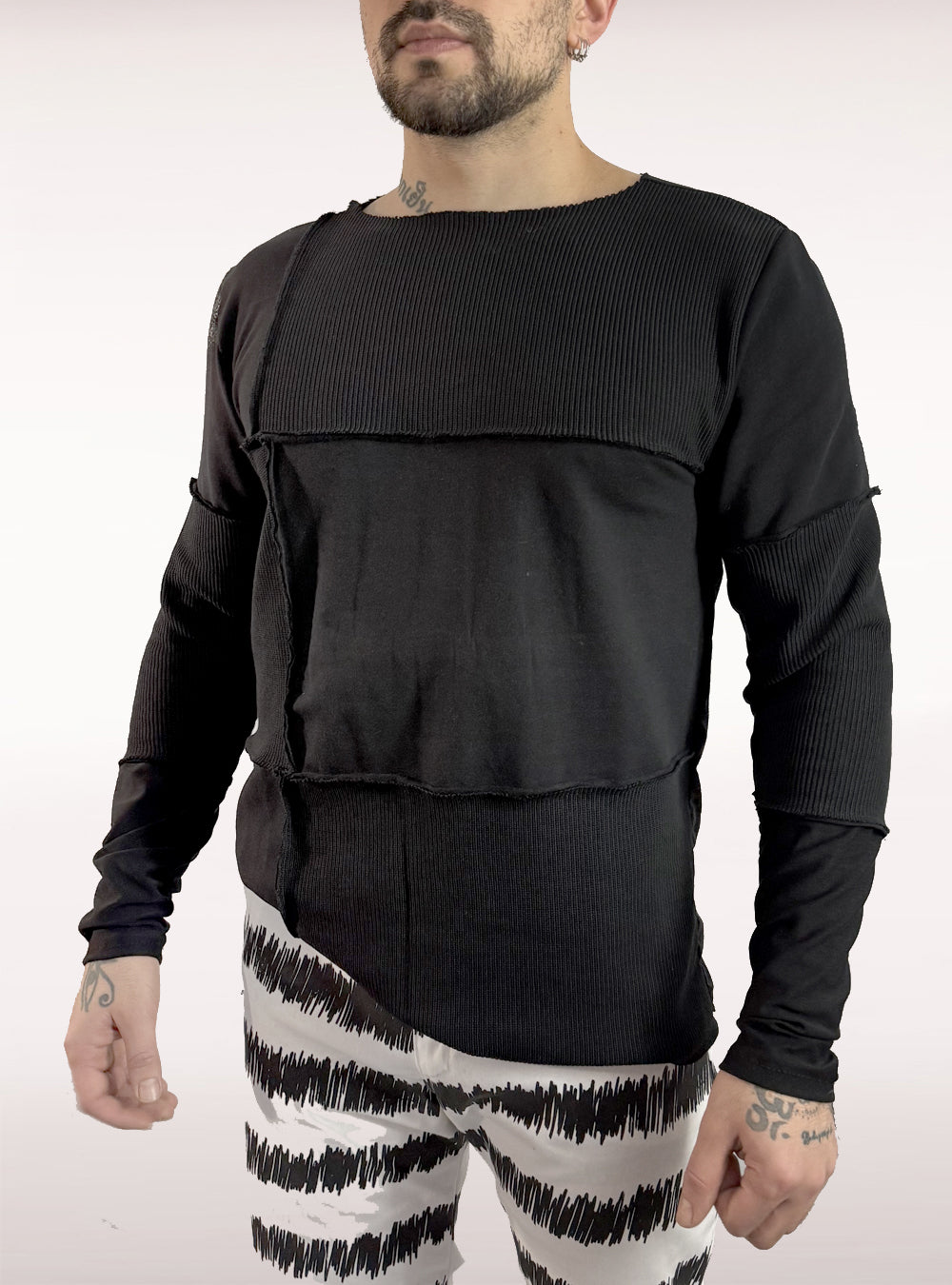 Weit geschnittener warmer Pullover mit Ziernähten auf der Brust. Teils Strickstoff, Teils Sweat. Unversäuberter Rundhals Ausschnitt.