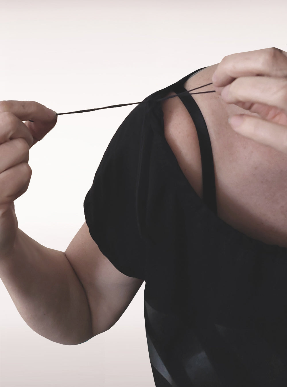 Der weite Kragen kann anhand von einer versteckten Schnürung individuell angepasst werden. Unversäumte Ärmel und Bundabschluss. Designershirt.